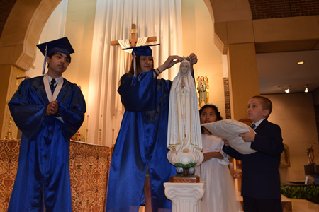 St. A's celebrated its traditional Crowning of the Blessed Mother and Passing of the Light ceremonies in a combined prayer service held on Monday, June 5. The service began with the 8th grade class processing into Church wearing their graduation caps and gowns, followed by the 2nd grade class processing in wearing their First Holy Communion suits and dresses. After the crown was placed on the statue of the Blessed Mother, the 2nd grade led the gathering of students, parents, and faculty in praying a decade of the Rosary.