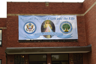 The moment arrived when John B. King, Secretary of the United States Department of Education, appeared on the large screen via YouTube explaining, “What is a Blue Ribbon School?” and who the 329 schools were. As the state’s Blue Ribbon Schools were shown the anticipation heightened for the entire school community, pastor, principal, parents and invited guests, faculty, staff and students (Pre-K 3-Grade 8) with blue hand-made streamers in hand and bags of blue confetti were ready. Everyone jumped up and burst into sounds of joy and warm words of pride.