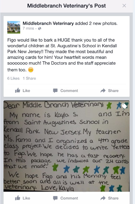 Kayla S., a fourth grader in Ms. Fama’s class, was touched by a news story of a Seeing Eye Dog who jumped in front of a bus to save her owner, so she asked if the class could design cards to send best wishes to this amazing dog. The students created beautiful "Get Well" cards for Figo, the hero dog. Cards were overnighted to the Veterinary Hospital where Figo is recuperating through the generosity of Kayla’s mom. All the children did their best work creating these cards. Figo, the doctors and nurses of Middlebranch Veterinary Hospital in Carmel, NY posted on Facebook their appreciation of the kind gesture of the class.