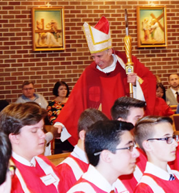 St. A's celebrated its traditional Crowning of the Blessed Mother and Passing of the Light ceremonies in a combined prayer service held on Monday, June 5. The service began with the 8th grade class processing into Church wearing their graduation caps and gowns, followed by the 2nd grade class processing in wearing their First Holy Communion suits and dresses. After the crown was placed on the statue of the Blessed Mother, the 2nd grade led the gathering of students, parents, and faculty in praying a decade of the Rosary.