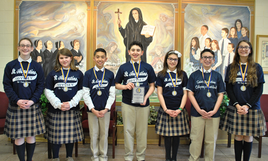 Our three Middle School Odyssey of the Mind Teams proudly display the medals and awards they earned at the Skylands Regional Tournament in Branchburg, NJ. With their 1st Place finish, the team competing in Division II on the problem "Emoji, Speak for Yourself" advanced to the New Jersey State Finals to be held in Ewing, NJ on April 14. The teams competing in Division II on the problems "A Stellar Hangout" and "Classics... Mockumentary? Seriously?" both finished in 3rd Place, with the Stellar Hangout team earning a perfect Long Term score with a unique self-learned STEM innovation. Congratulations again to our students and coaches, for being recognized for their creativity and their problem-solving skills.